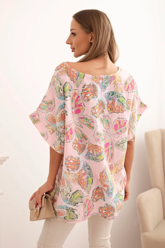 Moteriška medvilninė bluzonė su drugelių motyvu trumpomis rankovėmis cukrinė rožinė