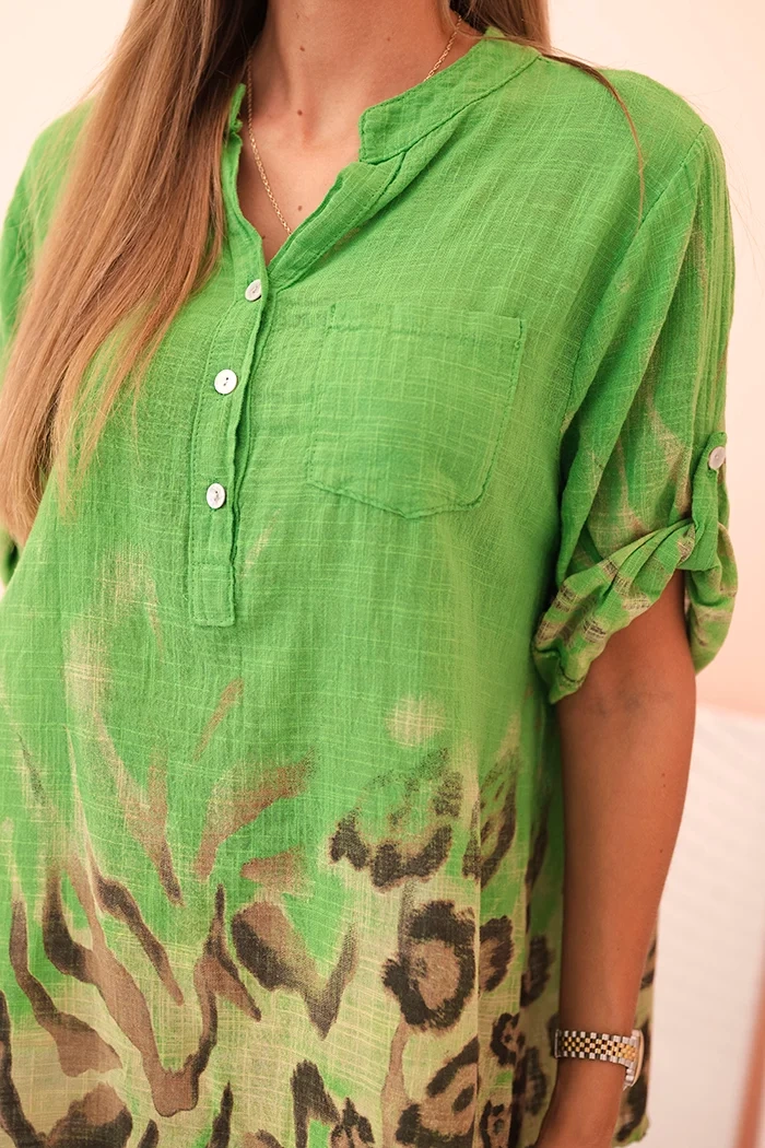 Ši moteriška marškinėlių yra puikus pasirinkimas moterims, kurios vertina patogumą ir madingą išvaizdą. Pagaminta iš 100% natūralios medvilnės, ji užtikrina dėvėjimo komfortą net šiltesnėmis dienomis. Laisvas kirpimas užtikrina judesių laisvę, o subtilus dekoltas su sagtimi ant sagutės suteikia jai kasdienio pobūdžio. Marškinėlių apačia puošiama efektingu gyvūnų raštu, kuris traukia akį ir suteikia stiliui išraiškingumą. Rankoves galima patogiai sulenkti ir užsegamas ant sagutės, tai daro ją dar funkcionaliau. Tai puiki pasirinkimas kasdien, į darbą, pasivaikščiojimui ar susitikimui su draugais. Dydis yra universalus ir tinkamas moterims, dėvinčioms S, M ar L dydžio.