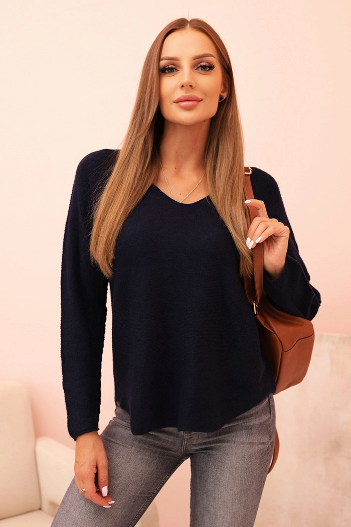 Moteriška megztinis su viskoze V-kaklu tamsiai mėlynas