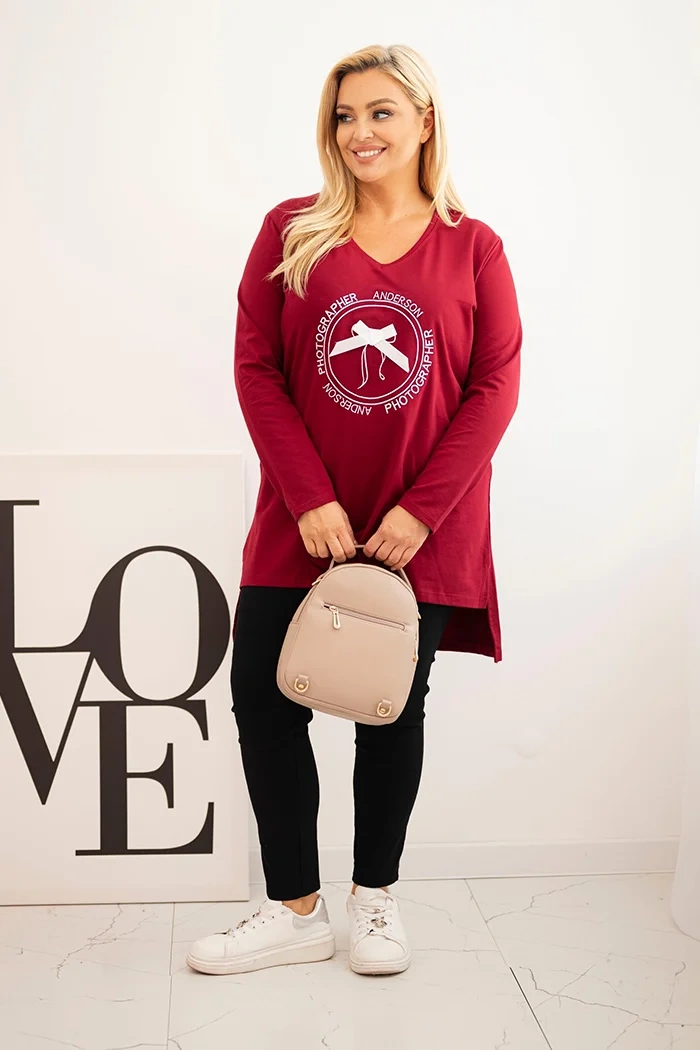 Moteriška palaidinė su ilgesne nugara ir spauda bordo