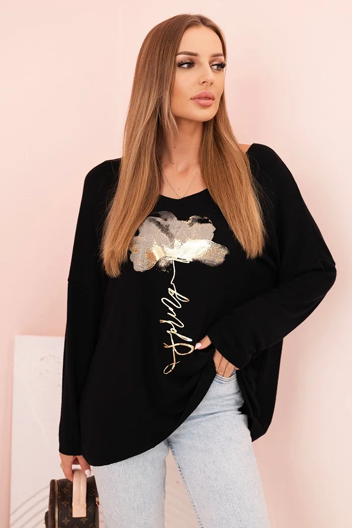 Modelis su laisvesniu siluetu ir šiek tiek nusileidžiančia rankove užtikrina komfortą ir judėjimo laisvę, o laivapriekio iškirptė suteikia visumai moteriško charakterio. Dekoratyvinis auksinis spaudinys traukia akį ir prideda stiliui išskirtinio žavesio.