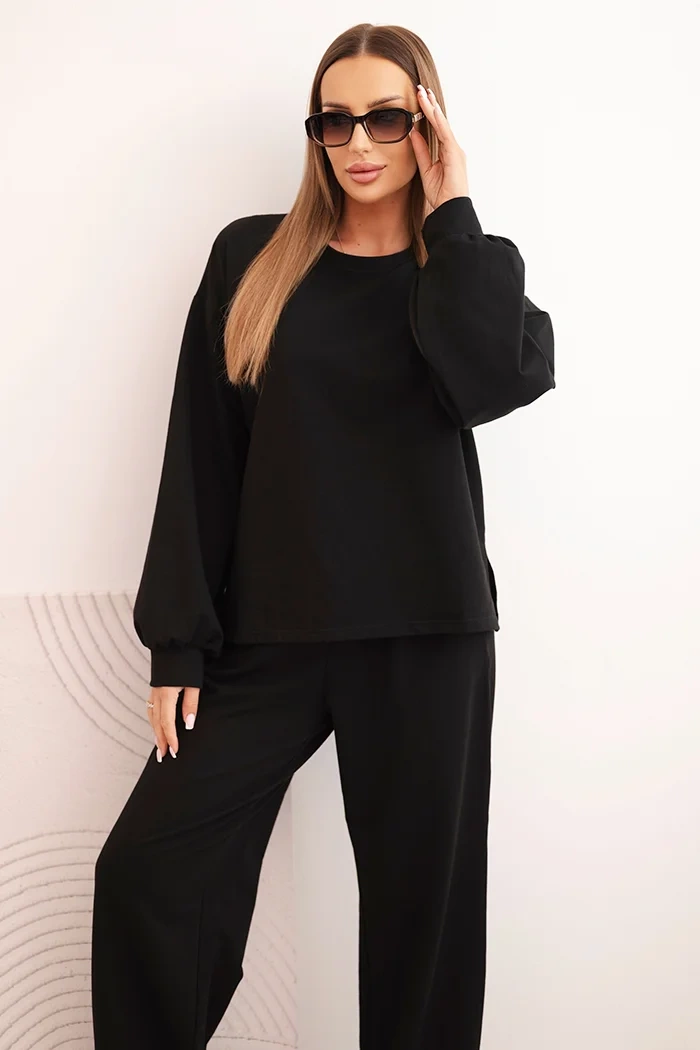 Moteriškas medvilninis komplektas su plačiomis kelnėmis ir ilgomis rankovėmis džemperiu juodas