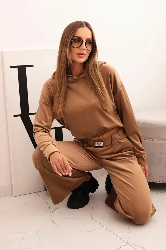 Šis moteriškas veliūrinis treningas yra patogumo, stiliaus ir šiek tiek prabangos derinys kasdienai. Džemperis su gobtuvu ir elastine juosta apačioje gražiai priglunda prie silueto, užtikrindamas komfortą ir madingą išvaizdą. Kelnės su plačiomis kojomis ir elastiniu diržu yra puikus pasirinkimas atsipalaidavimui namuose, pasivaikščiojimams ar neformaliems susitikimams.