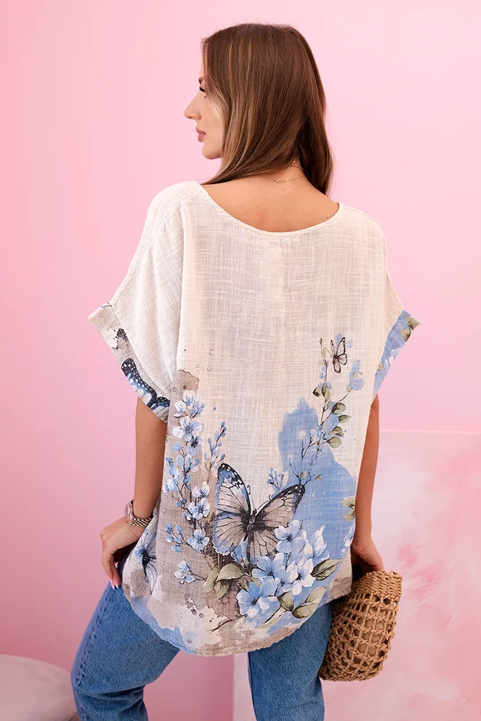 Pristatome lengvą ir orui pralaidžią moterišką palaidinę su trumpomis rankovėmis, puoštą romantišku drugelių ir gėlių raštu. Pagaminta iš 100% aukštos kokybės medvilnės, užtikrina patogumą net karštomis dienomis. Laisvas kirpimas puikiai paslepia figūros netobulumus, o natūrali medžiaga leidžia odai kvėpuoti. Puikiai tinka kasdieniam dėvėjimui, vasaros pasivaikščiojimams ar susitikimams su draugais. Švelnios spalvos ir subtilus raštas suteikia žavesio ir gaivumo. Pagaminta Italijoje.